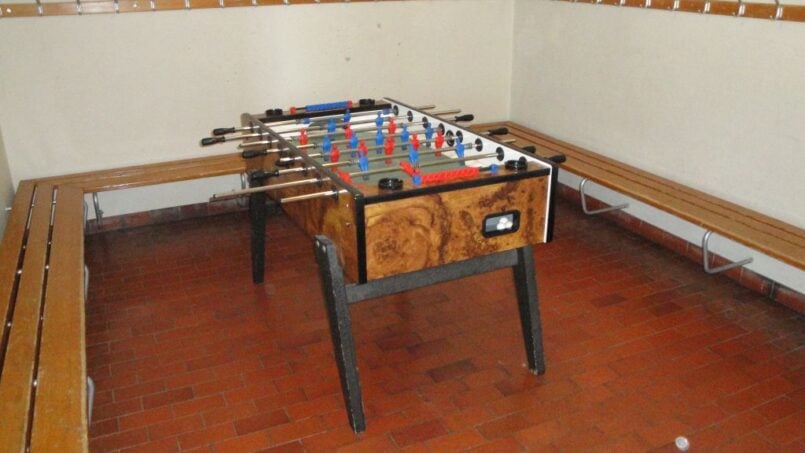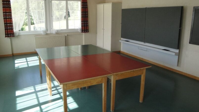 Essraum, Aufenthaltsraum mit Wandtafel, Klavier und Beamer, Spielräume mit Pingpongtisch und Fussballkasten.
