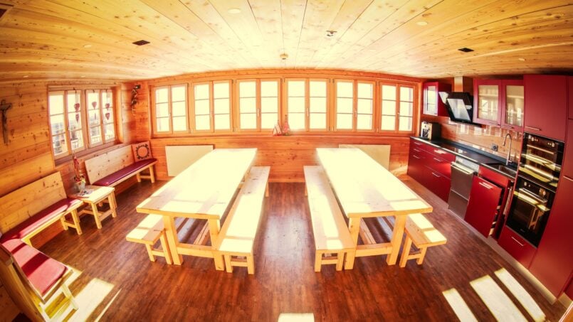 Im Pfründhaus stehen dir bis zu 13 Schlafplätze zur Verfügung. Du findest ein Einzelzimmer mit rollstuhlgängigem Bad, ein gemütliches Doppelzimmer mit Dusche und WC sowie zwei 4-Bettzimmer mit eigenem Bad. Im Dachgeschoss wartet zusätzlicher Raum für bis zu drei Personen. Die moderne, offene Küche ist in den grosszügigen Aufenthaltsraum integriert – perfekt zum Kochen und Zusammensitzen. Auf der Terrasse geniesst du den Blick auf die umliegenden Berge.