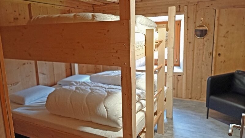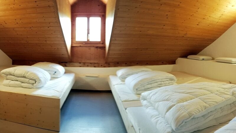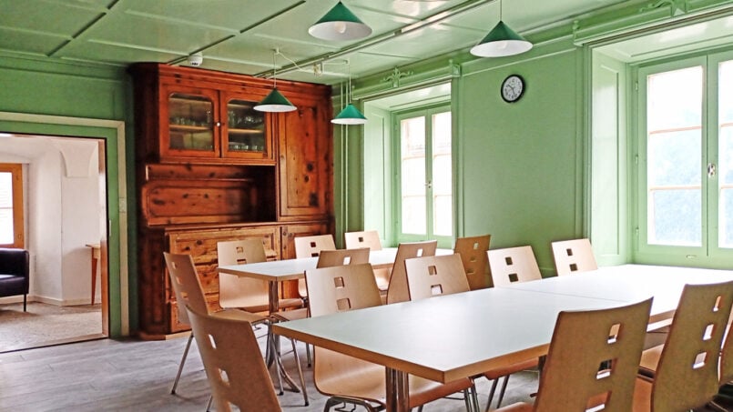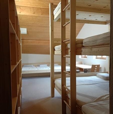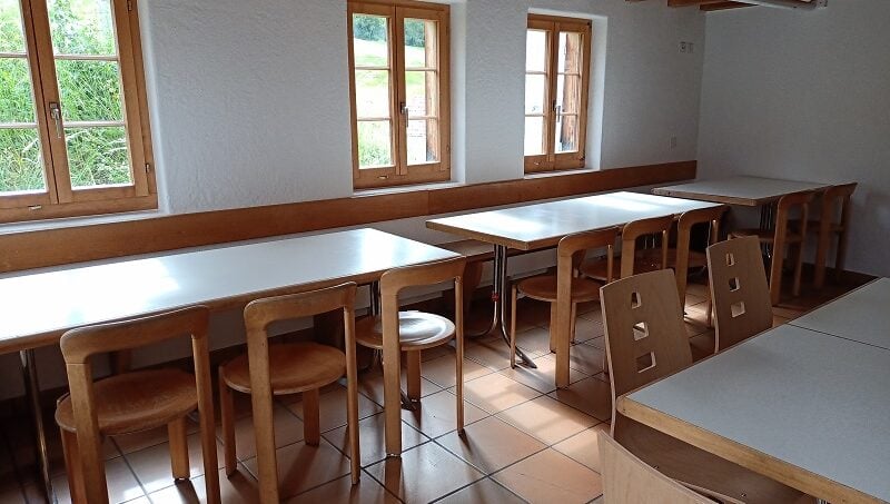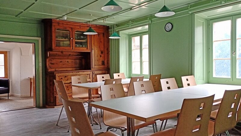 Die Gruppenunterkunft bietet Platz für 40 Personen. Die Zimmer sind vielfältig: von kleinen Einheiten mit 2 Betten bis hin zu einem grossen Schlafraum mit 13 Betten. Alle Betten sind bezogen. Zwei Essräume, eine Lounge mit Glasabtrennung und ein Aufenthaltsraum mit Töggelikasten bieten genug Platz für Gemeinschaft und Spiel. Draussen findest Du einen Spielplatz, einen Fussball- und einen Grillplatz.