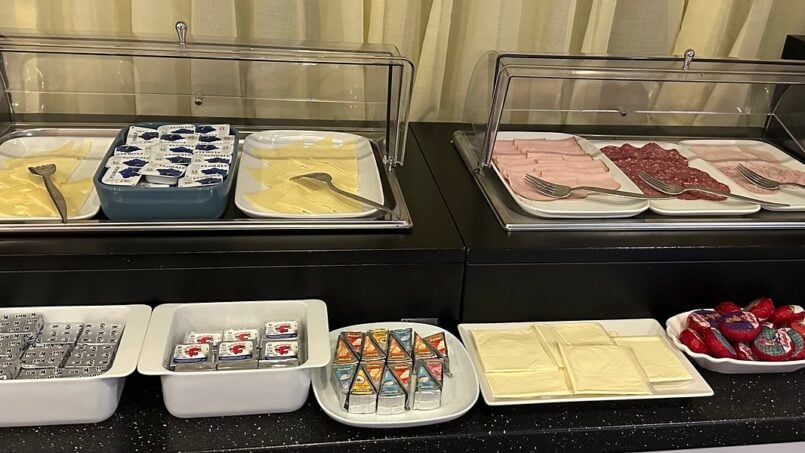 Tägliches Frühstück mit Brötchen, Aufschnitt, Käse und warmen Getränken